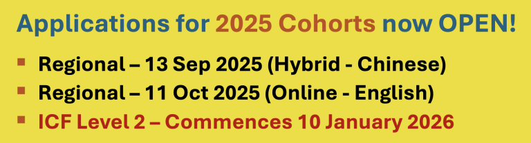 Our ICF Level 1 & 2 Coach Accreditation programs are offered in Hong Kong in Chinese in Hybrid format with the Hong Kong Society of Professional Training.